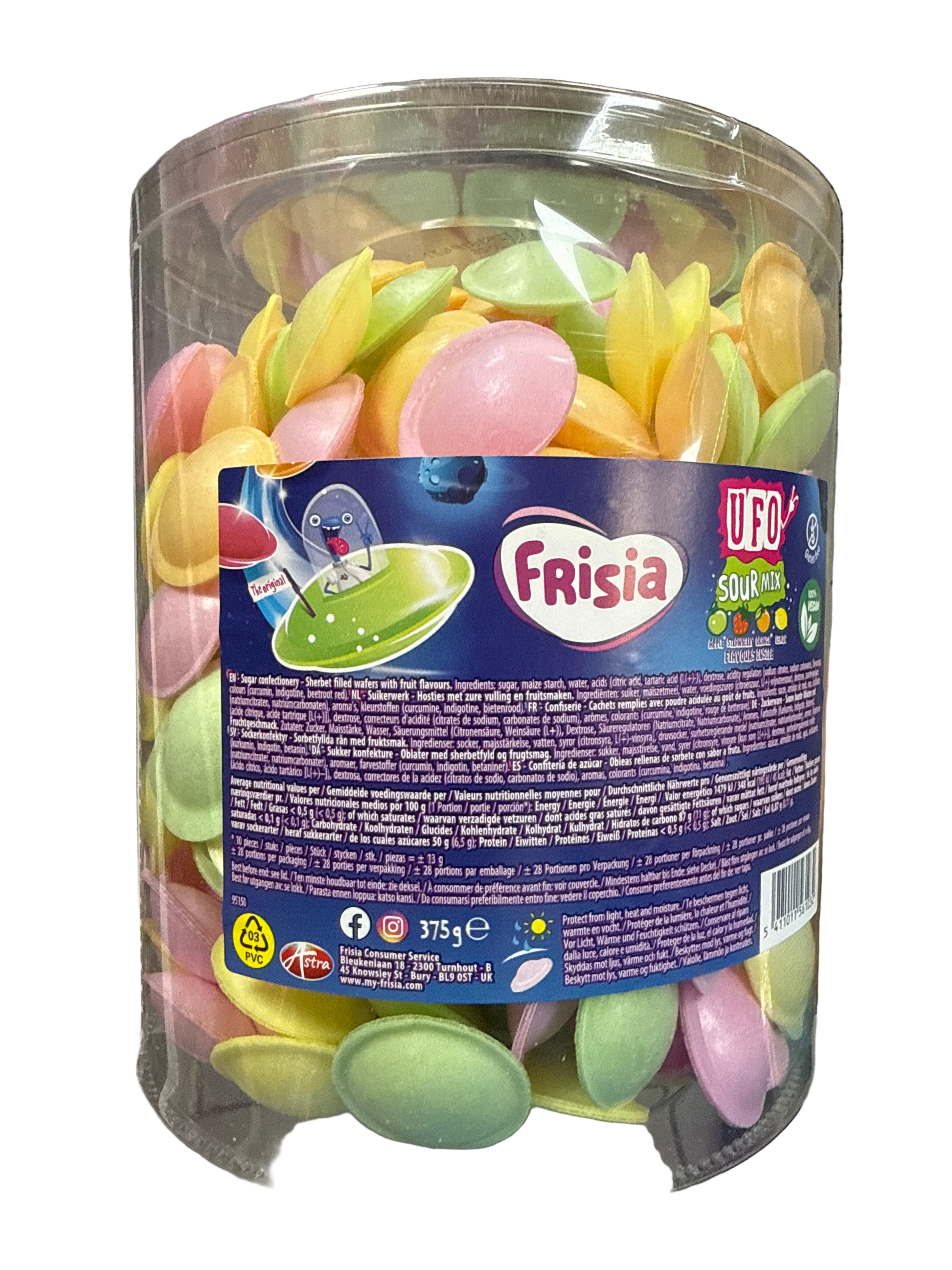 Flying Saucers are light, wafer-like candies shaped like UFOs, filled with a tangy, fizzy powder that bursts with flavor—classic, fun, and nostalgic.