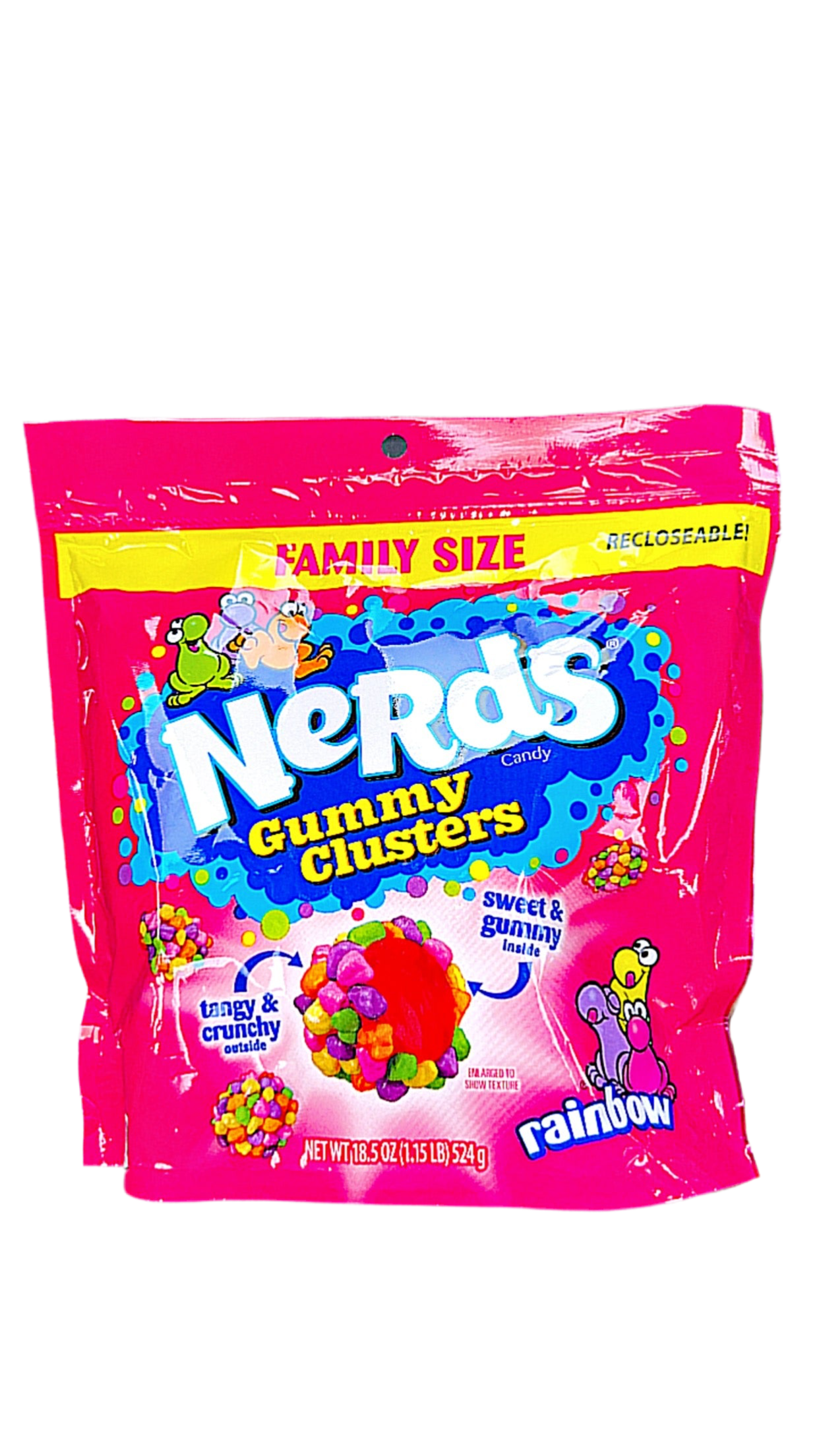 Nerd Gummy Clusters are a chewy candy treat featuring a combination of gummy candies coated with Nerds, the crunchy, tangy candy pieces. Each cluster typically consists of small, bite-sized gummy shapes covered in a layer of colorful Nerds candy, providing a contrast between the soft, chewy interior and the crunchy, tangy exterior. This combination delivers a burst of sweet and sour flavors with a fun texture mix, making Nerd Gummy Clusters a popular choice for candy lovers who enjoy a playful and flavorful treat.
